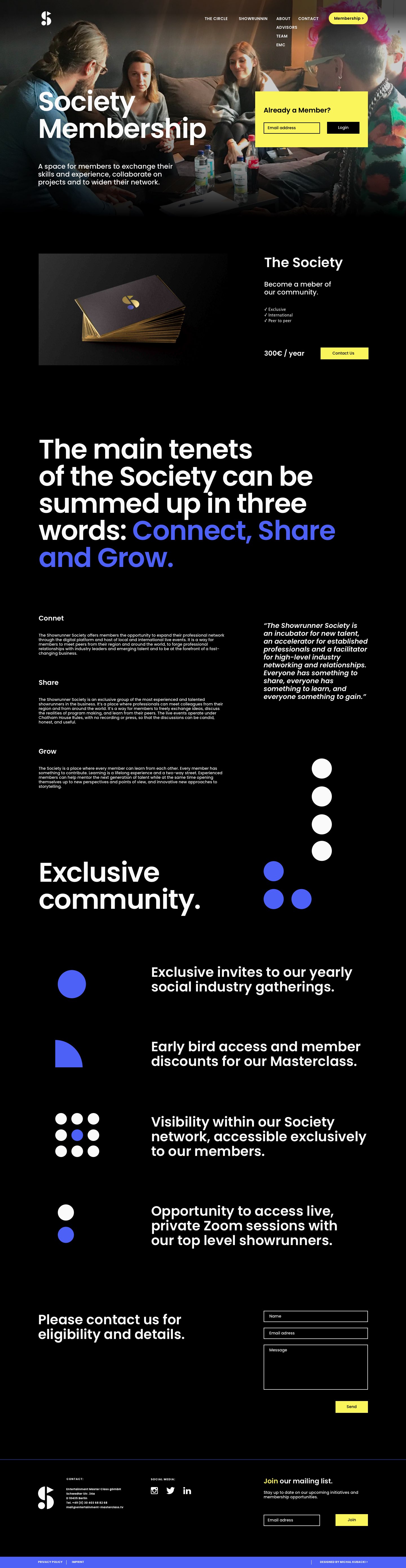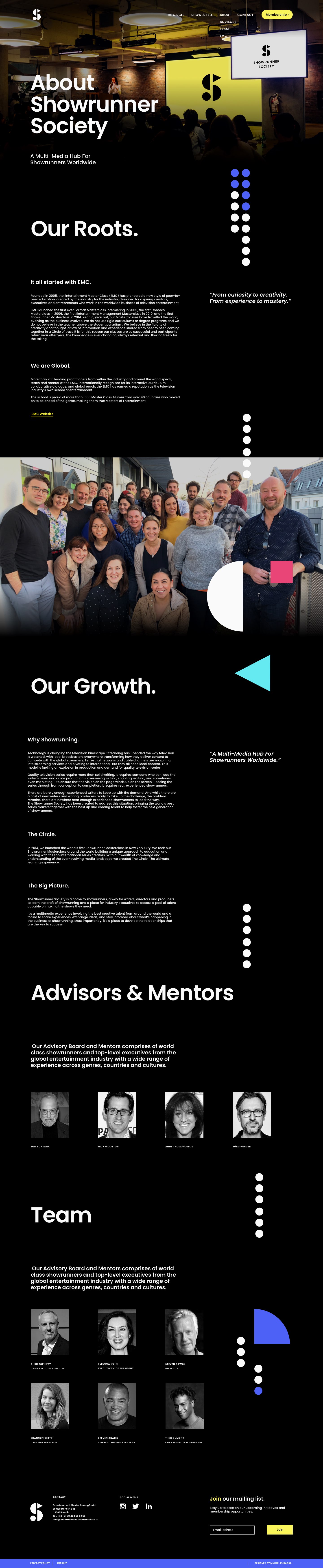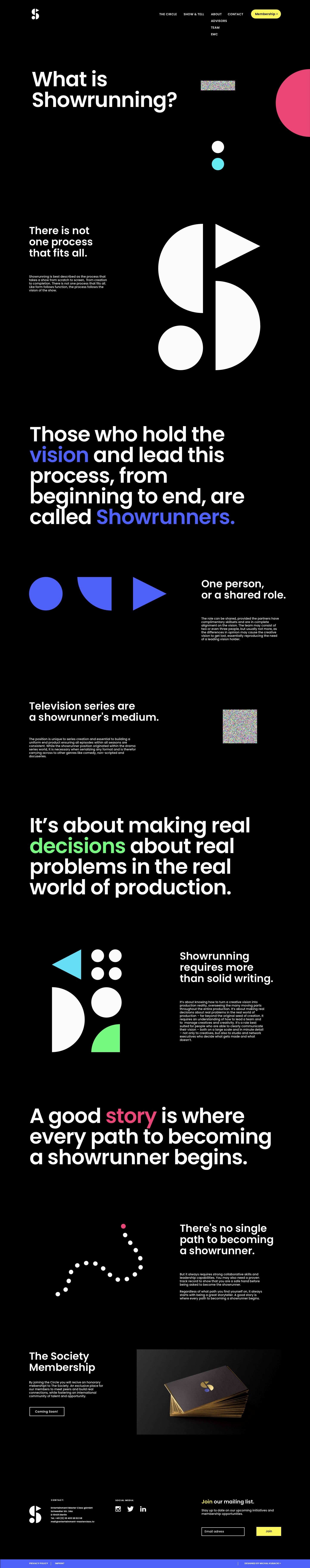 The Showrunner Society is a hub for experienced showrunners, a way for writers, directors, and producers to learn the craft of show running, and a place for industry executives to access a pool of talent. I was asked to design the brand identity and website design that will reflect their essence and relationship.